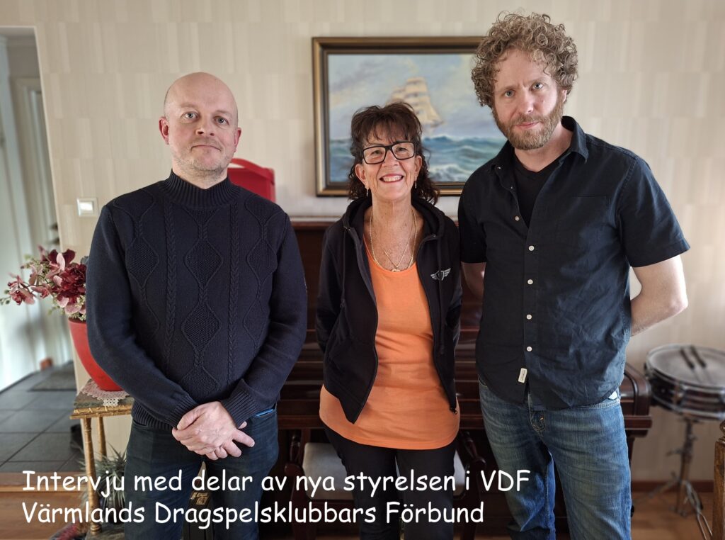 Här presenteras nya styrelsen för Värmlands Dragspelsklubbars Förbund. VDF. Ny ordförande är Mattias Nyström, Kassör Annelie Sjöden, sekreterare Martin Grentoft. Jan Olsson från Exporadion samtalar med nya styrelsen bl.a. om förändringar och nytänkande som är nödvändigt att genomföra inför kommande festivaler. Allt för att Bälgspelet ska kunna fortsätta många år framåt i tiden. Nästa Bälgspel vid landsvägskanten går av stapeln sommaren 2027.